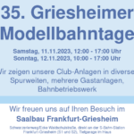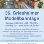 - 8. und 9. November 2025: 37. Griesheimer ModellbahntageEs ist bald wieder soweit: Am 8. und 9. November 2025 veranstalten wir die 37. Griesheimer Modellbahntage in Frankfurt Griesheim. Wir erwarten dieses Jahr auch wieder Gäste mit ihren Modellbahnanlagen. Weiterlesen